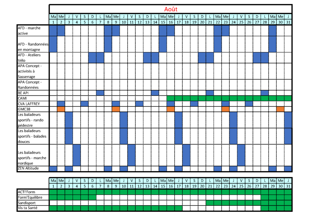 - l’AFD38 avec la marche active au Parc Paul Mistral (« L’été !Oh Parc ») et à Pablo Picasse, les randonnées en montagne et les ateliers vélo les dimanche et lundi ;