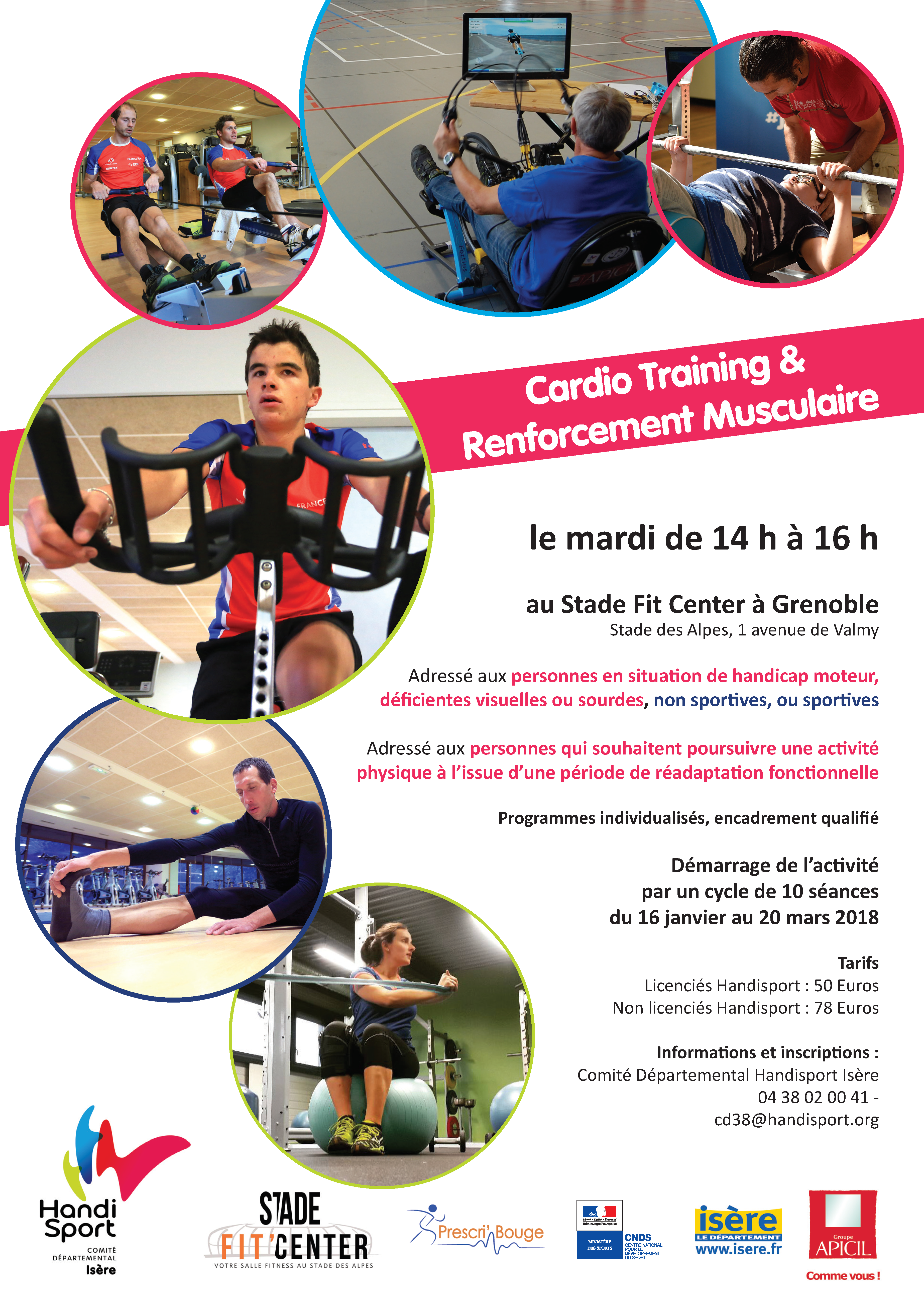Le Comité Départemental Handisport Isère, dans le cadre de son action Sport-Santé, met en place un atelier Handisport "renforcement musculaire et cardio training" le mardi de 14 h à 16 h,
