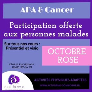 Acti’Forme offre l’accès à tous ses cours d’Activités Physiques Adaptées aux personnes atteintes d’un cancer (quel qu’il soit) pendant tout le mois d’octobre.