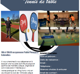 Découverte du tennis de table santé Si vous désirez pratiquer une activité physique de manière ludique et originale vous permettant de vous dépenser, vous amuser et apprendre le tennis de table, alors n’hésitez plus ! Venez découvrir l’activité Ping Tonic qui est une activité axée sur la dépense d’énergie et l’apprentissage […]